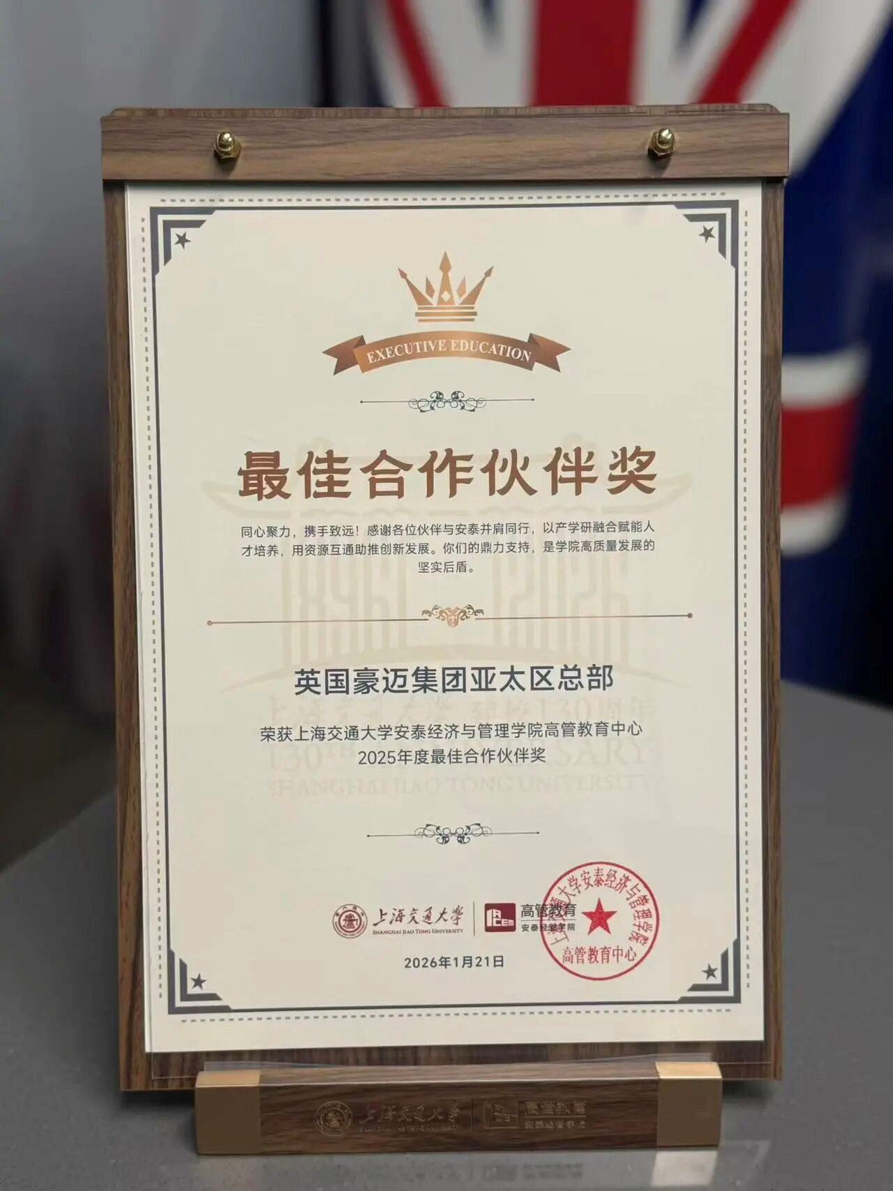 近日,英国豪迈中国凭借与上海交通大学安泰经济与管理学院的深度校企合作,荣获由交大安泰学院颁发的“2025年度最佳合作伙伴”奖。这一荣誉既是对双方过往校企交流与合作的高度认可,更是对英国豪迈中国在跨国企业管理、人才培养赋能等方面专业实力的权威佐证。